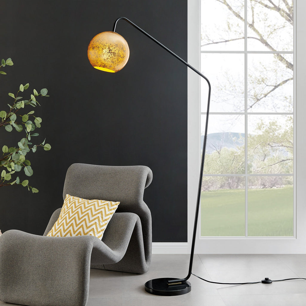 This arcing floor lamp features a gold metallic foil "mercury" glass globe and a black marble base. The angled metal arm has a satin black finish. A matching table lamp is also available!