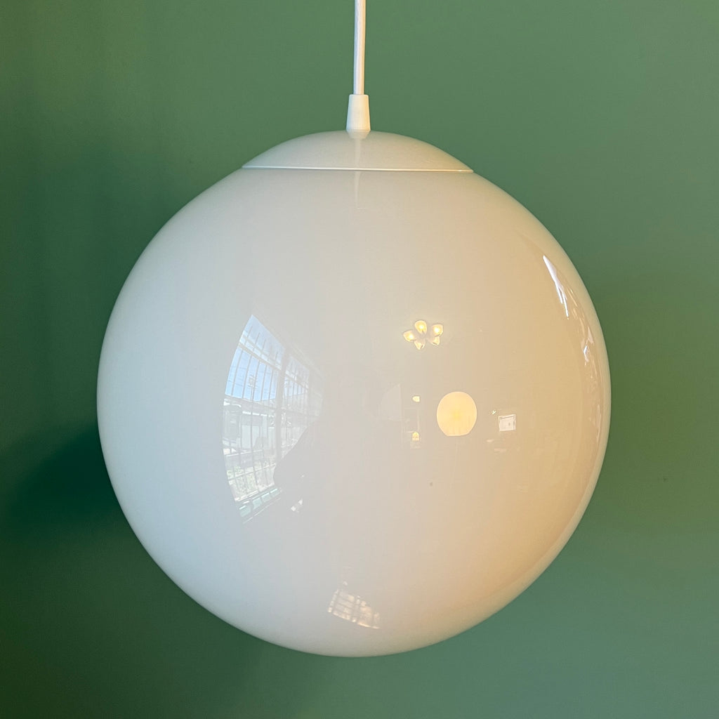 These classic globe pendants are a versatile way to light any space. The opal glass diffuses light beautifully, and the adjustable cord hardware provides a variety of hanging options.