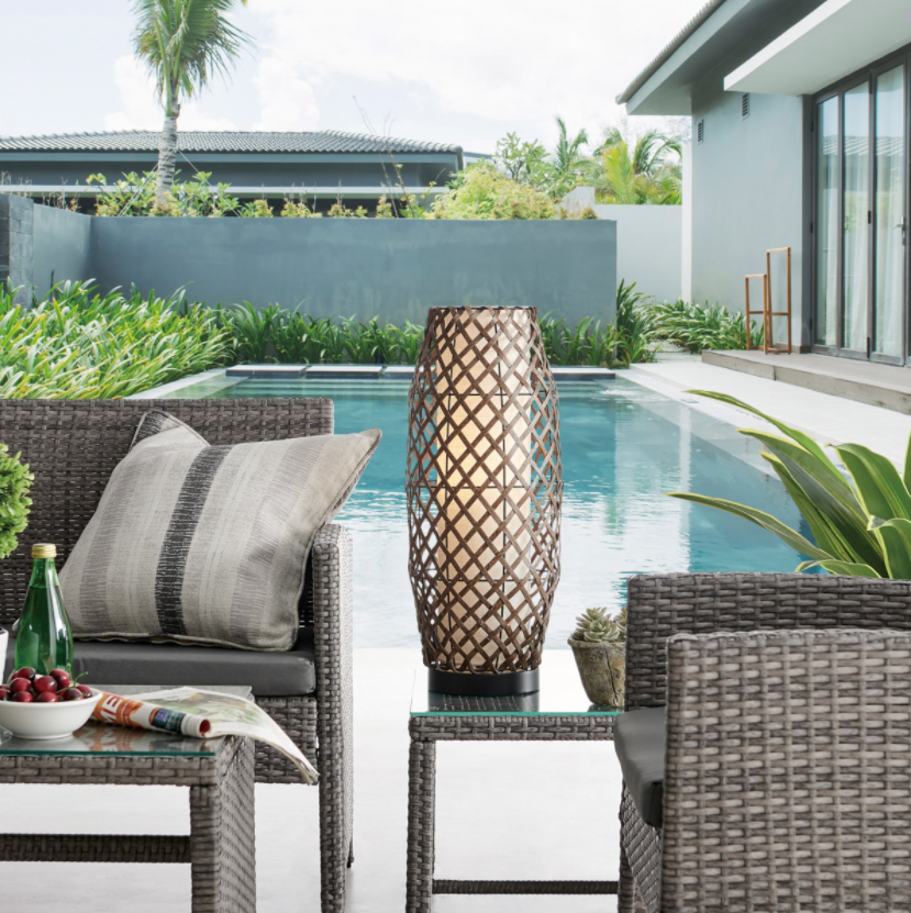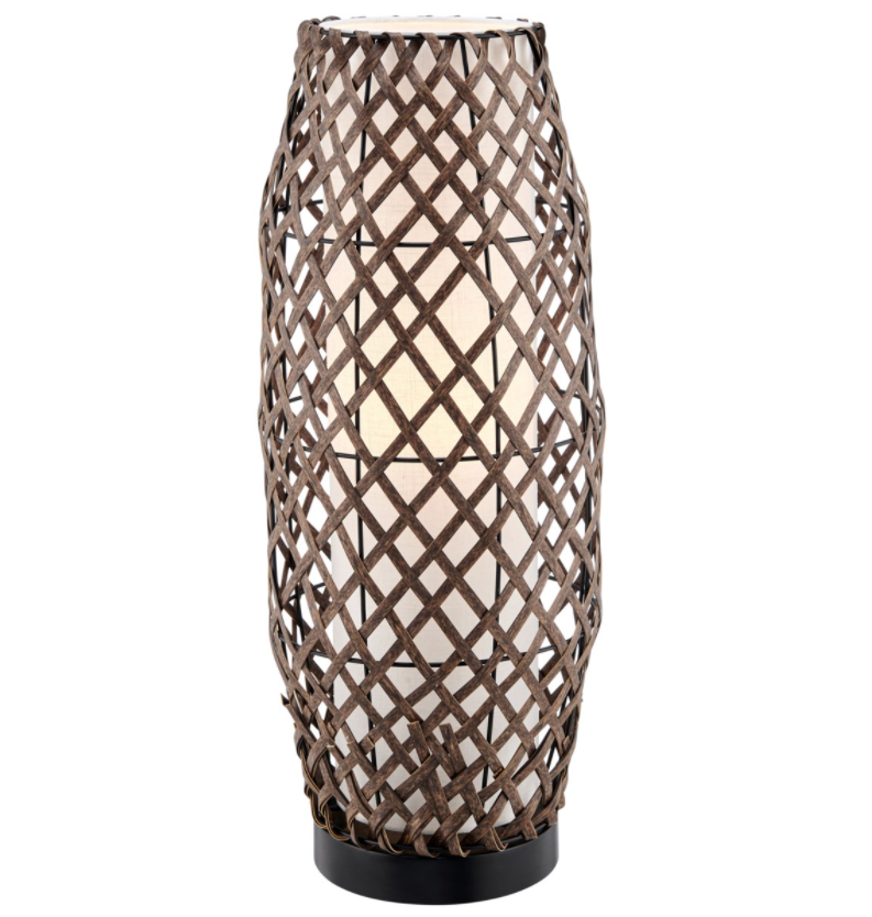 This innovative outdoor table lamp perfectly blends retro style with modern technology for an irresistible combination! A layered shade of natural woven rattan lined with textured textured linen rests on a sleek black metal base for a contemporary look. This lamp features a rechargeable LED bulb with two different brightness settings! Simply unscrew the bulb and use the supplied power cord in and USB outlet to recharge the bulb. This fixture is 100% cordless and waterproof, making it the perfect accent for your patio, porch, or poolside bungalow!