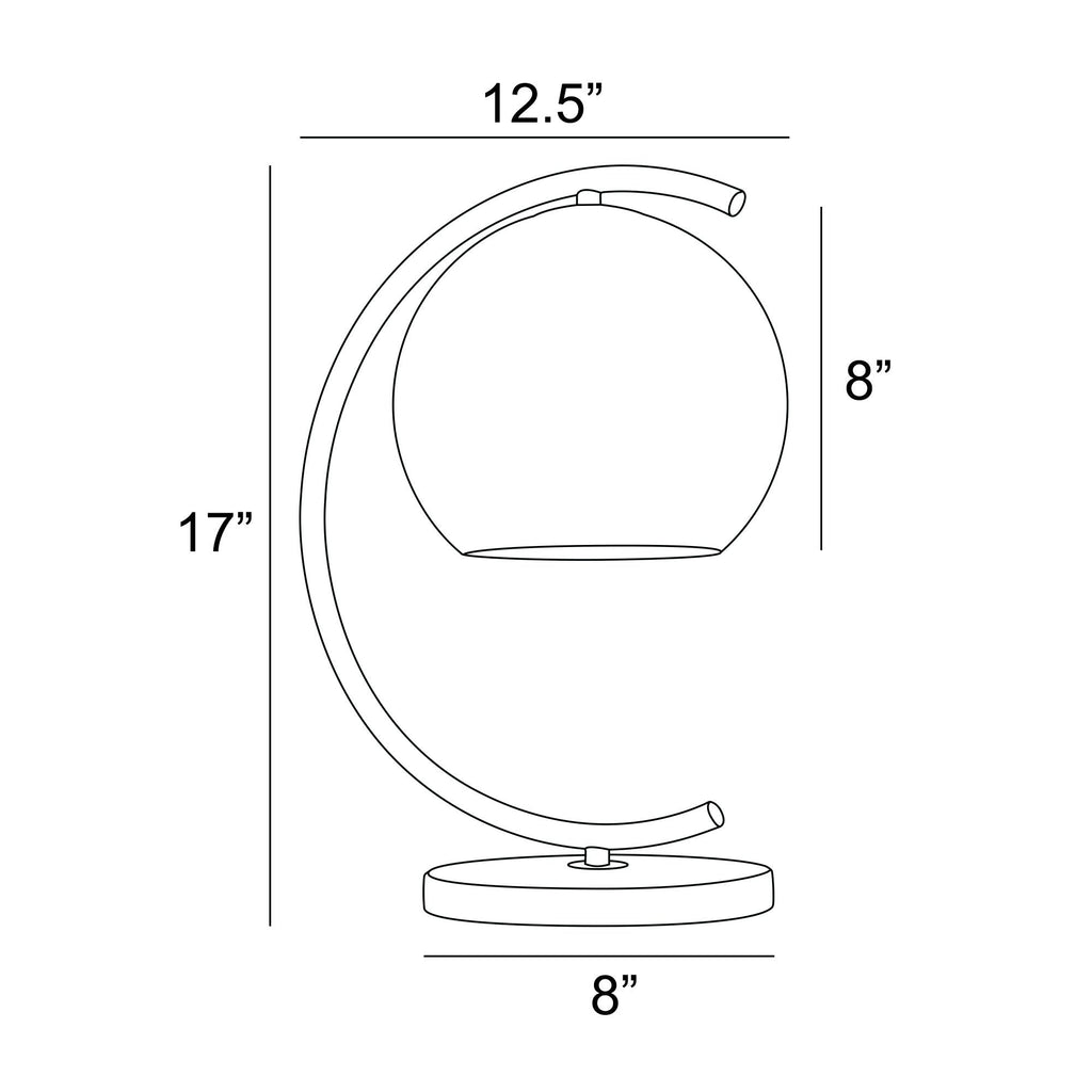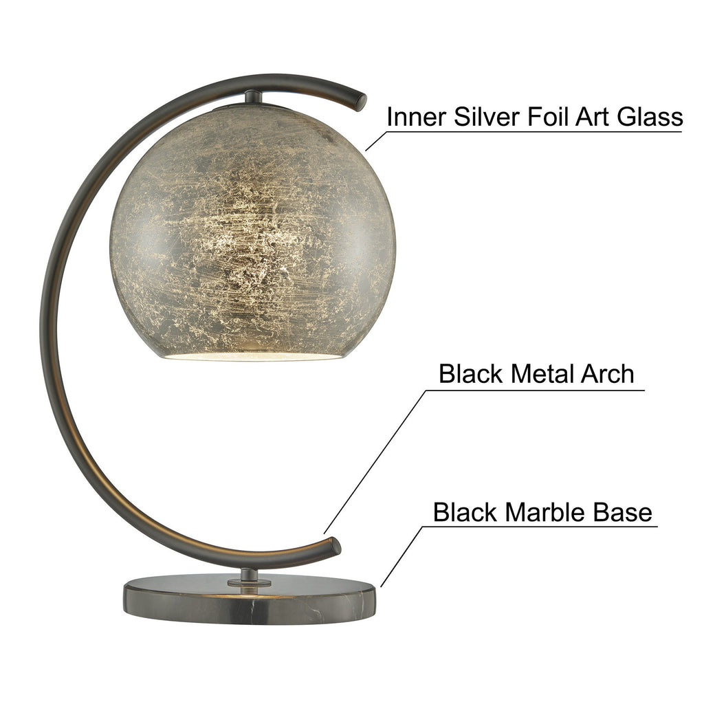 This table or desk lamp features a silver metallic foil "mercury" glass globe and a black marble base. The metal arch arm has a satin black finish. A matching table lamp is also available!