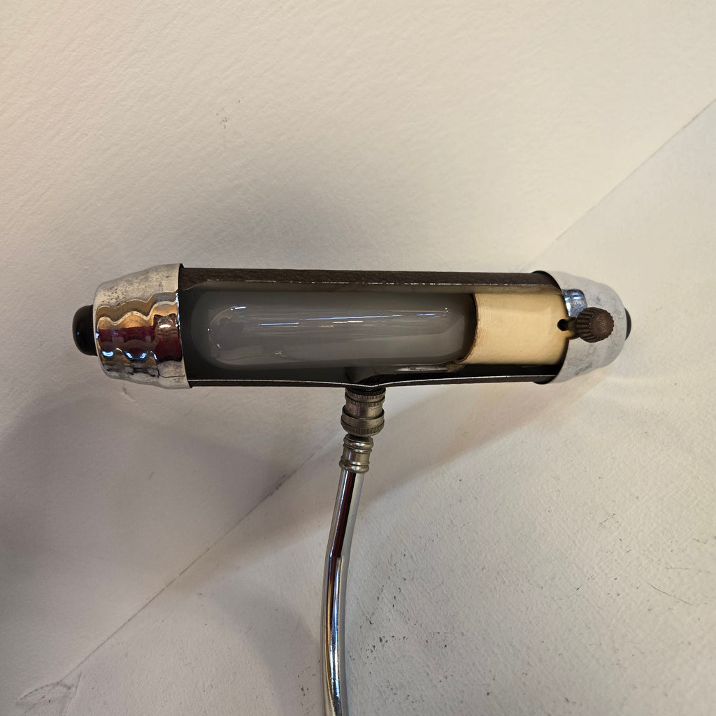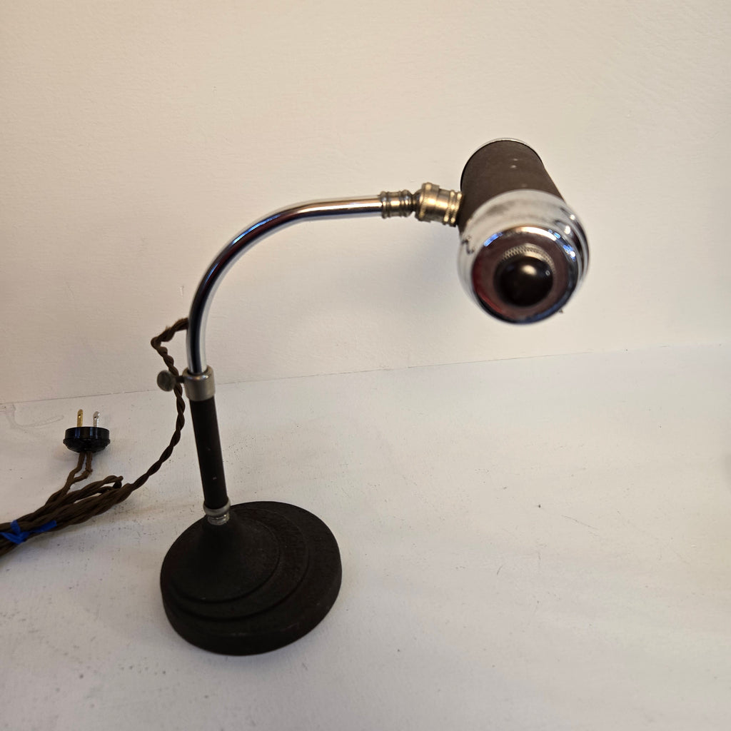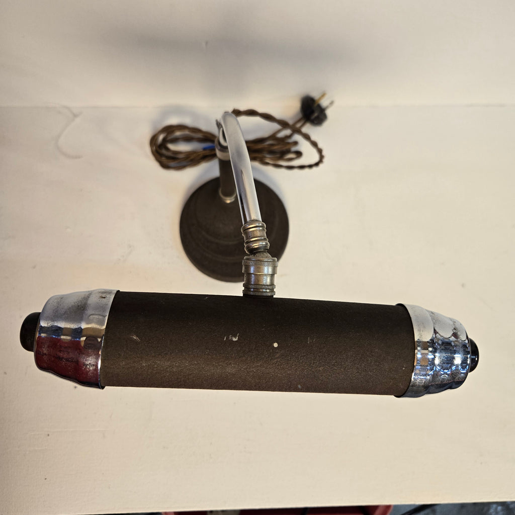 Antique art deco piano or desk lamp in textured matte antique bronze metal with polished chrome accents from the 1920s. Features a slim adjustable metal shade is designed for tube lightbulbs. Fully re-wired with brown twisted cloth cord.