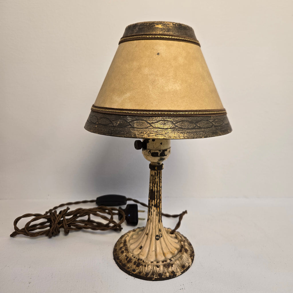 Antique hand-painted ivory metal mini table lamp with parchment and gold leaf clip-on shade. Fully re-wired with brow twist cloth cord and switch.