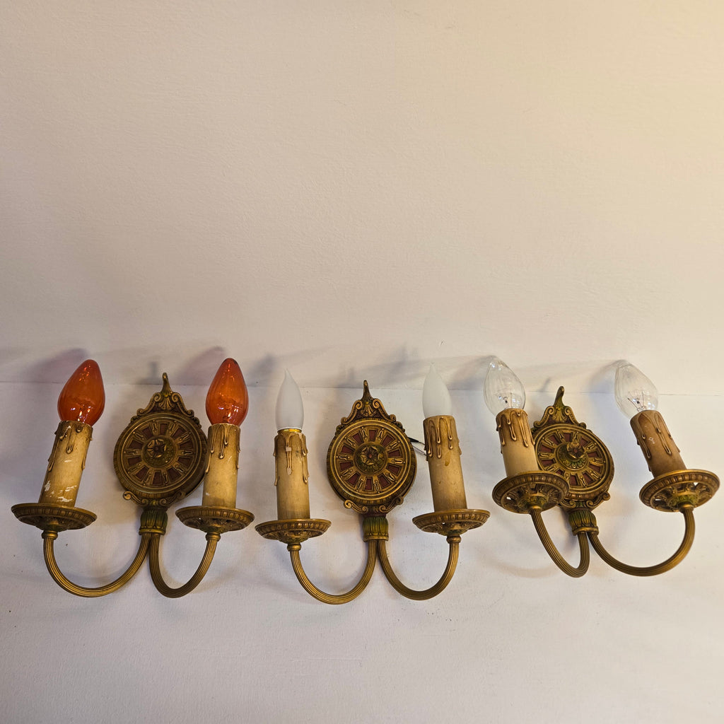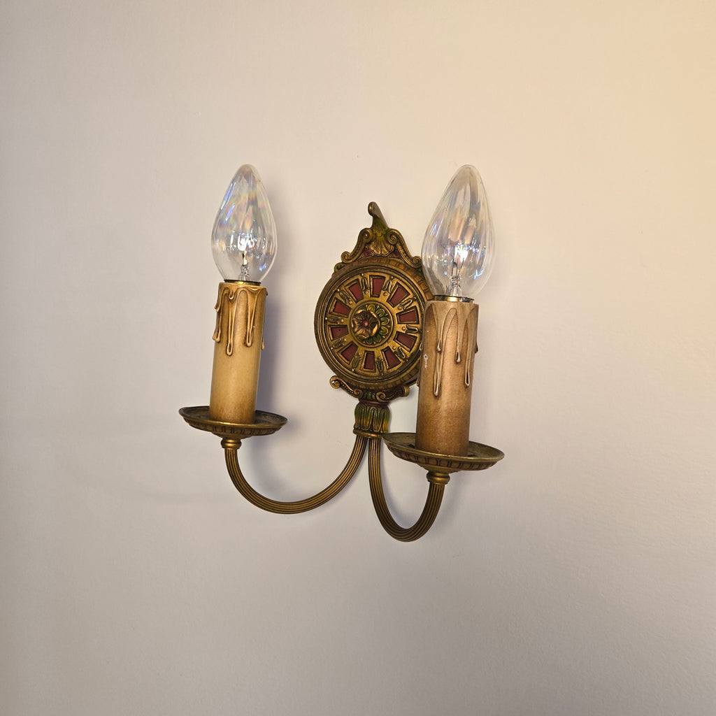 Set of 3 matching 1930s 2-light wall sconces. Brass fluted/embossed design with hand-painted floral and geometric designs in red and green. Gorgeous antique condition, fully re-wired.