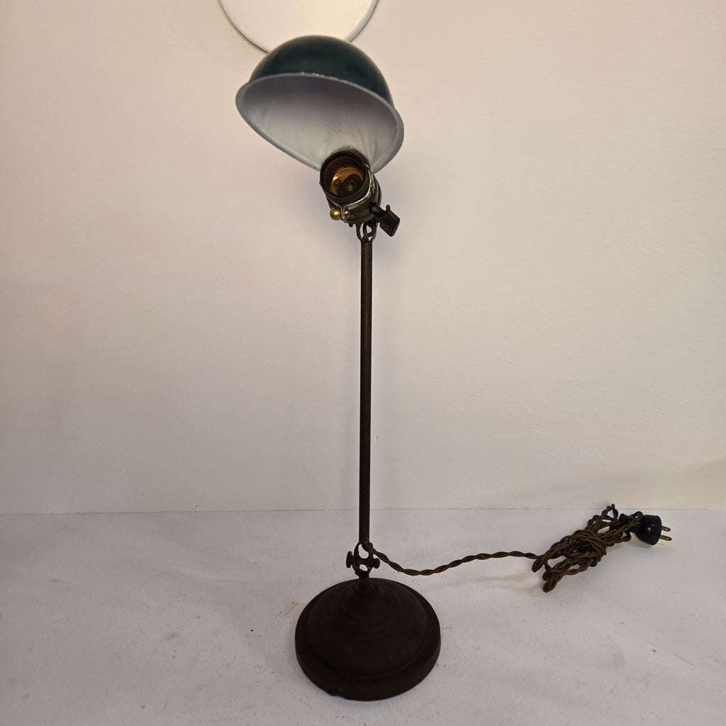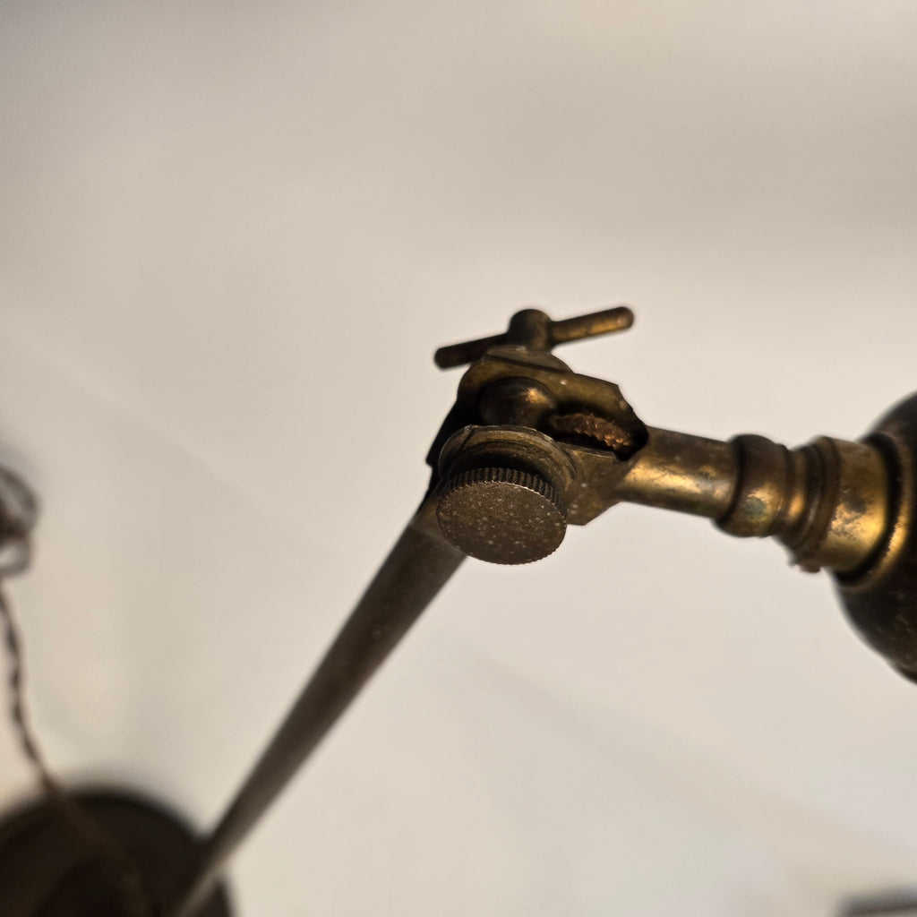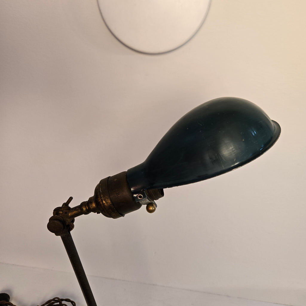 Vintage desk lamp with heavy, dark antique brass patina base and dark green parabolic metal shade. Highly adjustable and fully re-wired with brown twisted cloth cord. Excellent vintage condition.