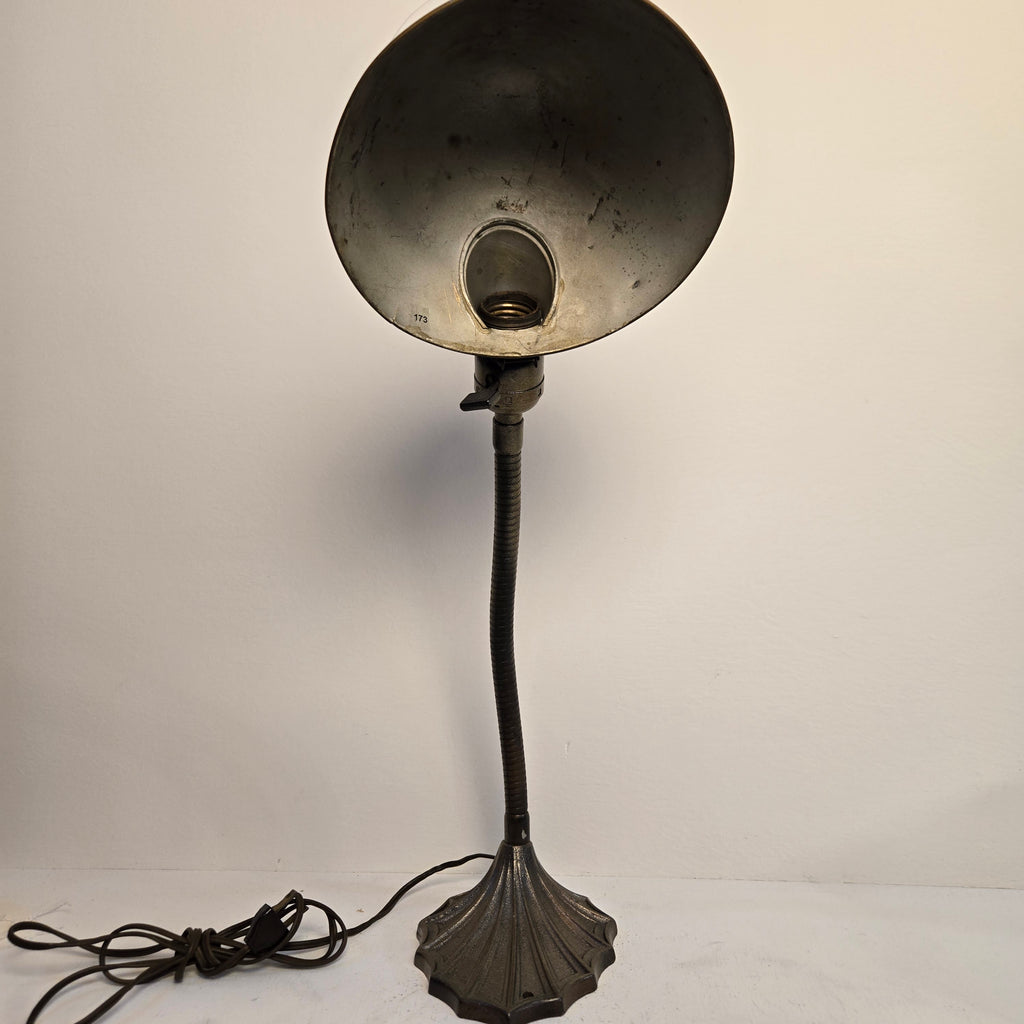 Vintage desk lamp with antique brass patina base and black parabolic metal shade. Highly adjustable and fully re-wired with brown twisted cloth cord. Excellent vintage condition.
